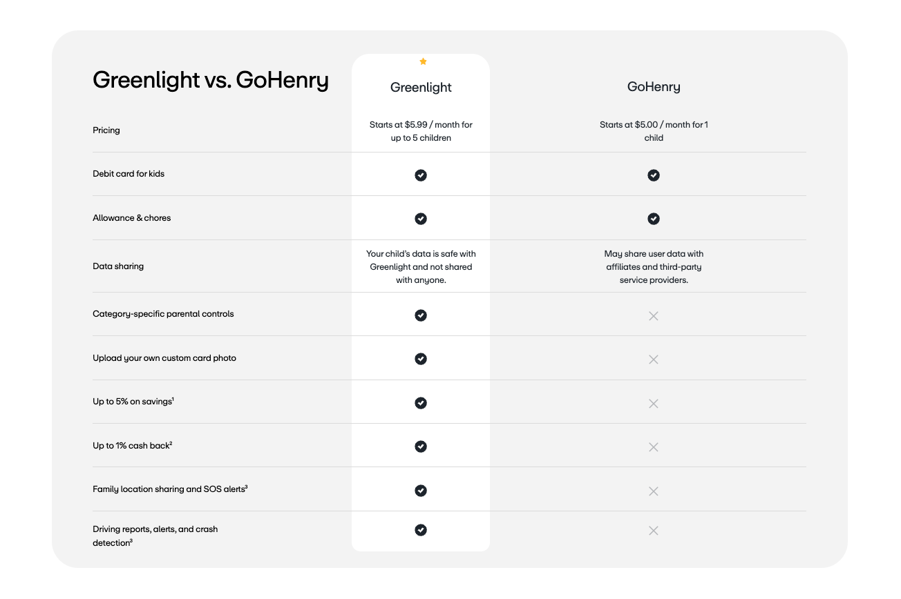 Greenlight is the “power user” option. If you have more than one child, Greenlight is a no-brainer because their $5.99 plan covers up to five children, whereas GoHenry costs $5 per child.